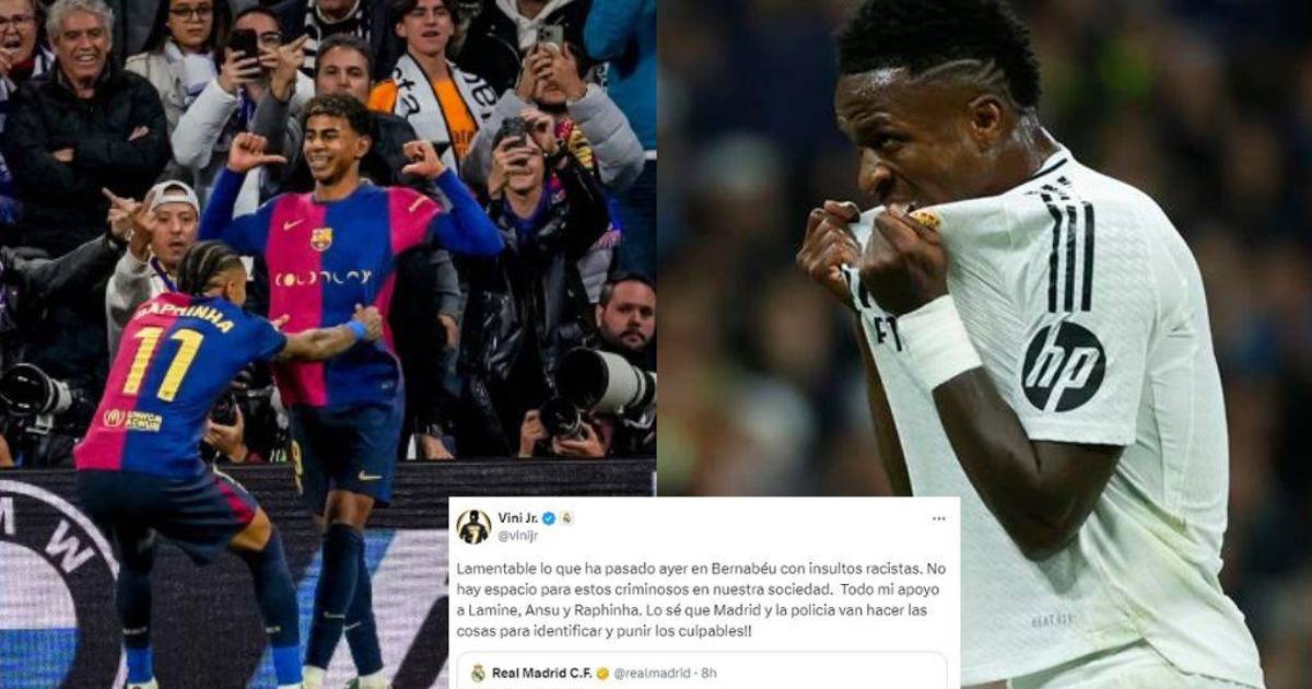 “Lamentable lo que pasó ayer en el Bernabéu con insultos racistas. No hay espacio para estos criminales en nuestra sociedad. Todo mi apoyo a Lamine, Ansu y Raphinha. Sé que el Madrid y la policía van hacer las cosas para identificar y castigar a los culpables”, escribió Vinicius en su espacio en X.