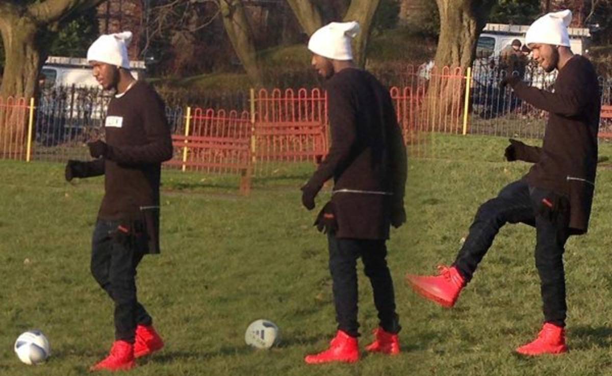 En las ocho fotografías que el catracho compartió en facebook, sale vestido con pantalón negro, camisa café y un gorro blanco en su cabeza y pateando una pelota junto a su retoño mayor.