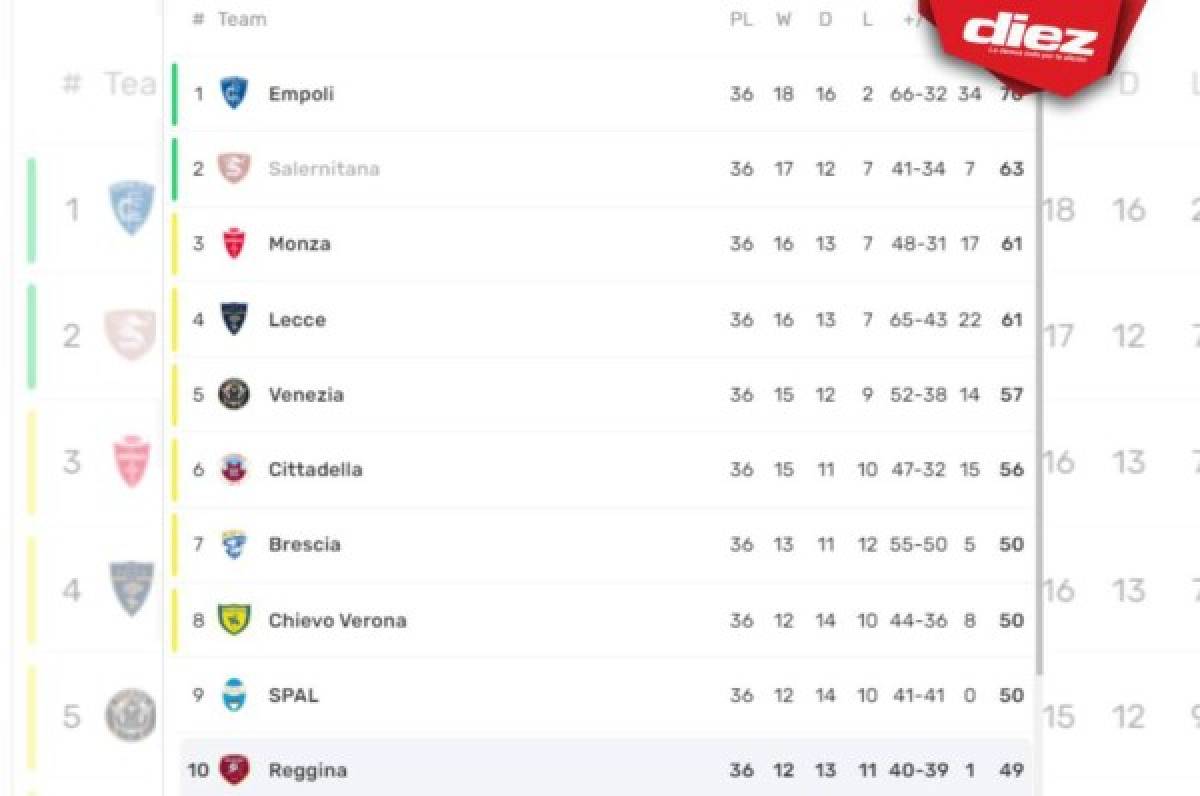 Con este resultado el Reggina se quedó relegado en la décima posición con 49 unidades y nulas posibilidades de ascender a la Serie A a falta de dos jornadas para el cierre.