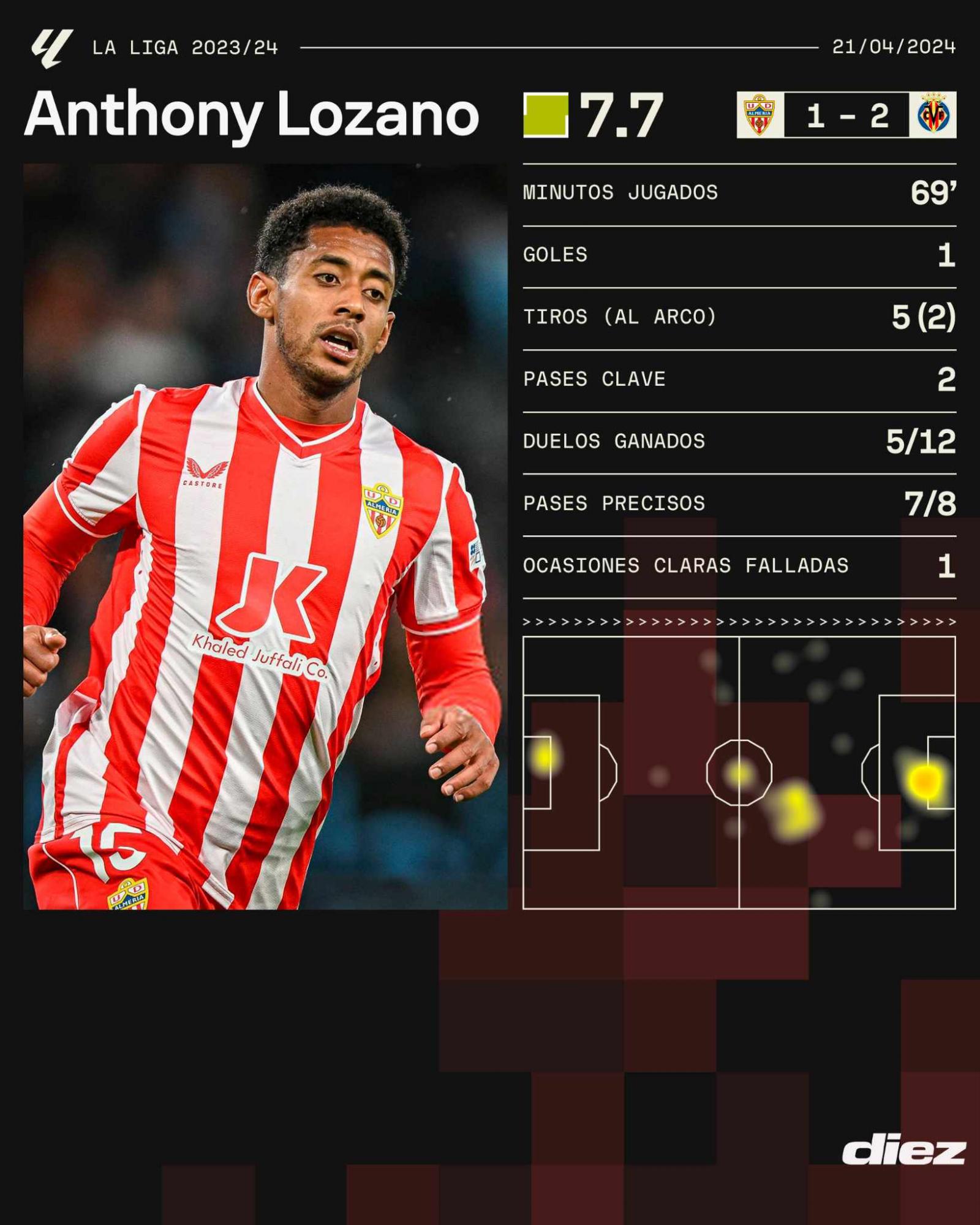 Fue el primer gol oficial de Lozano en la presente temporada. Cabe señalar que llegó en enero al Almería tras seis meses de haber militado en el Getafe.