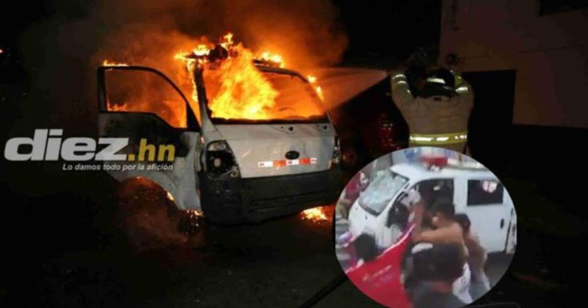 Resultó que varios hinchas merengues, enfadados con la Policía Nacional por haber lanzado gas lacrimógeno, atacaron y quemaron una de sus unidades cerca del bulevar Morazán, Tegucigalpa.