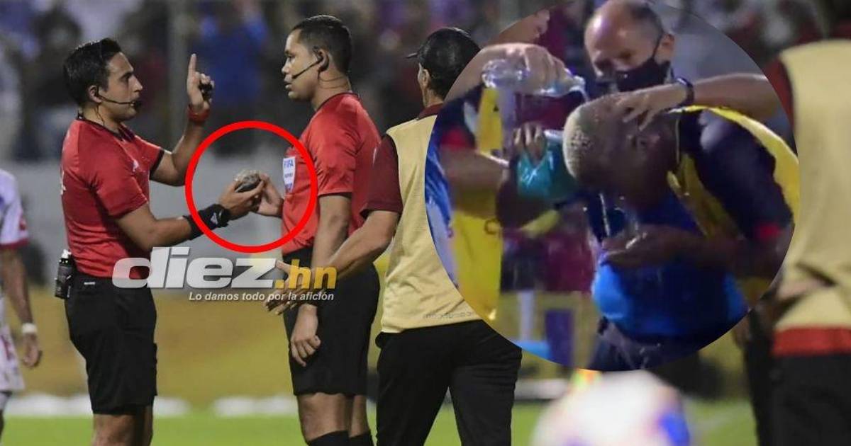 Kevin Álvarez, lateral derecho del Real España, fue quien terminó lanzando el impacto y tuvo que recibir asistencia médica, ya que esta alcanzó su cabeza.