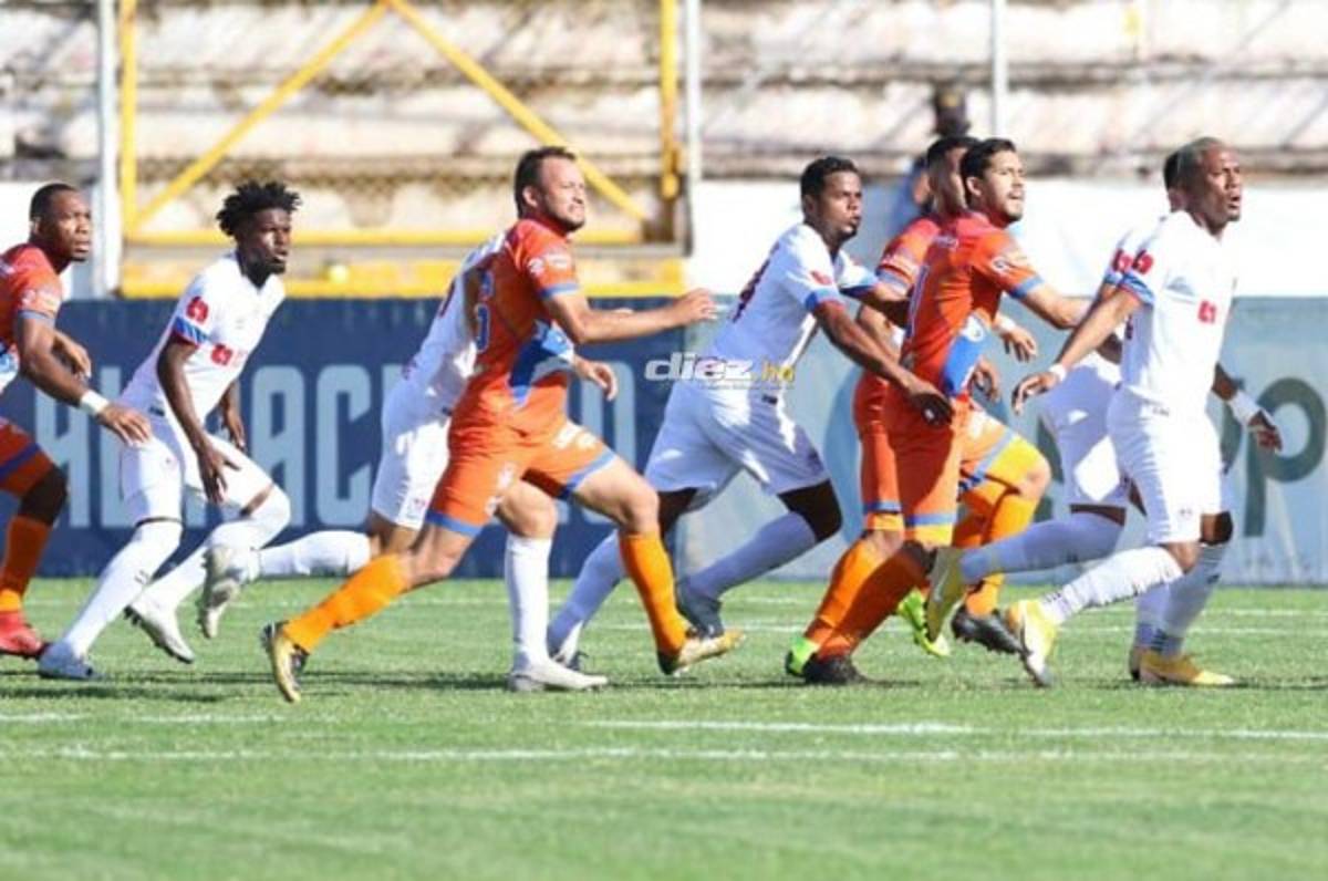 Minuto 43: ¿Era penal? Marvin Bernárdez cae en el área de UPNFM y los futbolistas reclamaron falta pero el árbitro no pitó nada.
