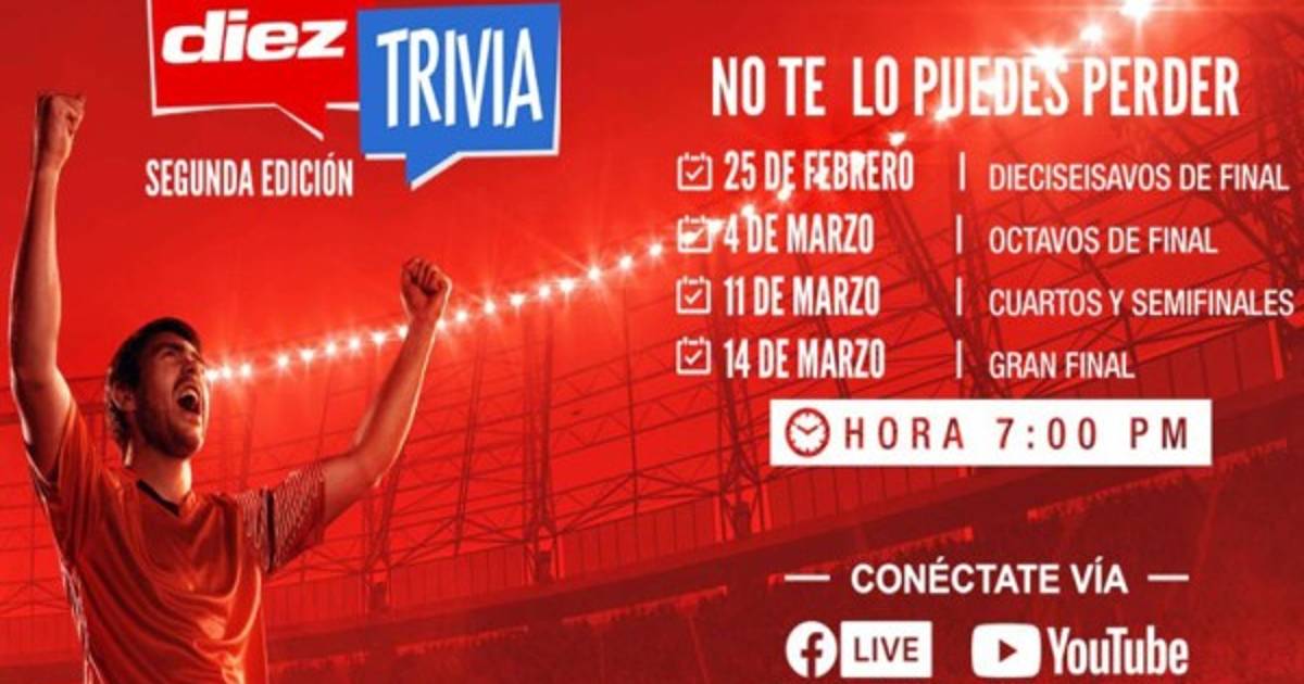 La primera ronda de la Trivia Diez es la de dieciseisavos de final, que se llevará a cabo este jueves 25 de febrero, luego continuarán los octavos de final que se realizarán el próximo 4 de marzo.Posteriormente, el 11 de marzo se van a disputar los cuartos de final y las semifinales, mientras que la gran final será el 14 de marzo.