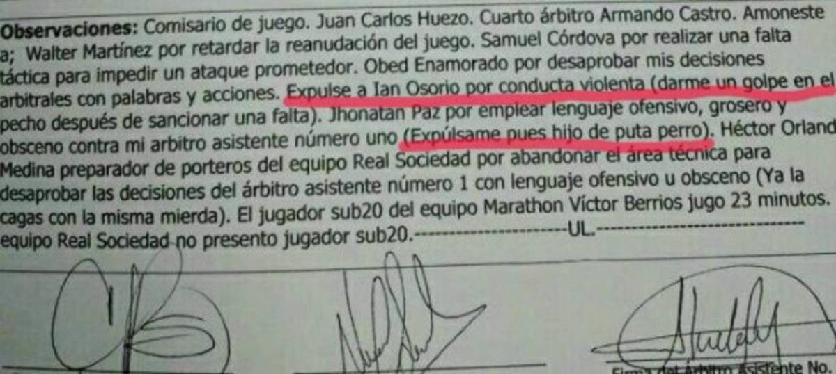 El nazareno explicó que: 'Expulsé a Jonathan Paz por emplear lenguaje ofensivo, grosero y obsceno contra mi árbitro asistente número uno. (Expulsame pues hijo de puta perro)'. Esto sin duda le traerá problemas al zaguero hondureño.