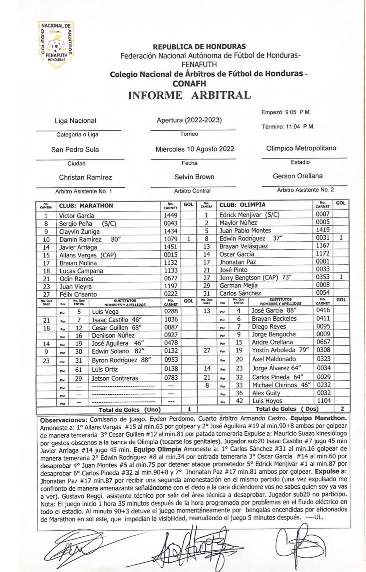 De acuedo al acta arbitral emitida por la cuarteta arbitral encabezada por Selvin Brown, Paz le dijo: “Expulsé a Jonathan Paz al minuto 87’ por recibir una segunda amonestación en el mismo partido. Una vez expulsado me confrontó de manera amenazante señalándome con el dedo a la cara y diciéndome ‘vos no sabes quién soy yo, ya vas a ver’”.