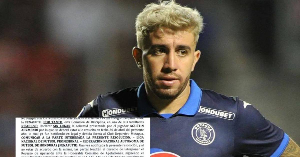“Esta Comisión de Disciplina, en uso de sus facultades resuelve: Declarar sin lugar la solicitud presentada por el jugador Agustín Auzmendi por lo que se deberá estar a lo resuelto en fecha 30 de abril del presente año, lo cual ya fue notificado en legal y debida forma al Club Deportivo Motagua”, dice el comunicado.