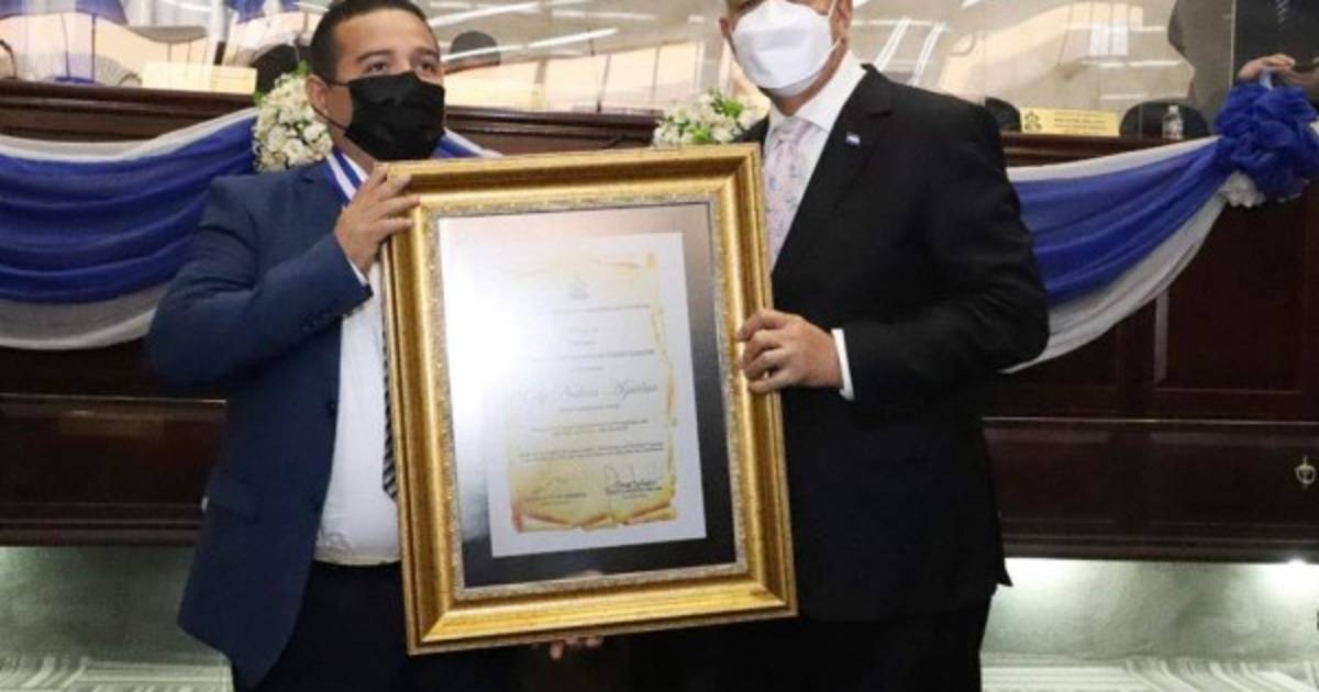 Mauricio Oliva, presidente del Congreso Nacional, le pone una medalla a Nahún Aguilar.