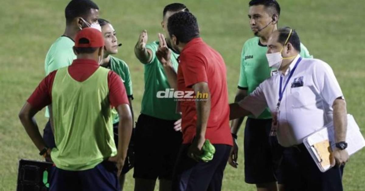 Membreño salió del banquillo hasta el centro del campo en busca de la cuarteta para reclamarle por las faltas que no sancionó y otras acciones en favor de su equipo que no consideró justas.