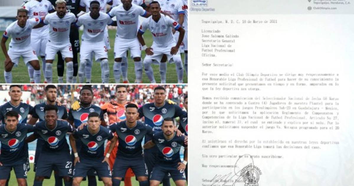 Luego agrega: 'Hemos recibido comunicación del Seleccionador Nacional de fecha 06 de marzo donde se ha convocado a cuatro jugadores de nuestro plantel para la participación en los Juegos Preolímpicos Sub-23 de Gudalajara, México, por lo que solicitamos la aplicación del Reglamento de Campeonatos y Competencias de la Liga Nacional de Fútbol Profesional. Artículo 27 inciso e), numeral 3), el cual se entiende y se explica por si solo. Por lo anterior solicitamos suspender el juego Vs Motagua programado para el 20 de marzo', dice la carta firmado por Sebastián Pastor, secretario del Olimpia.