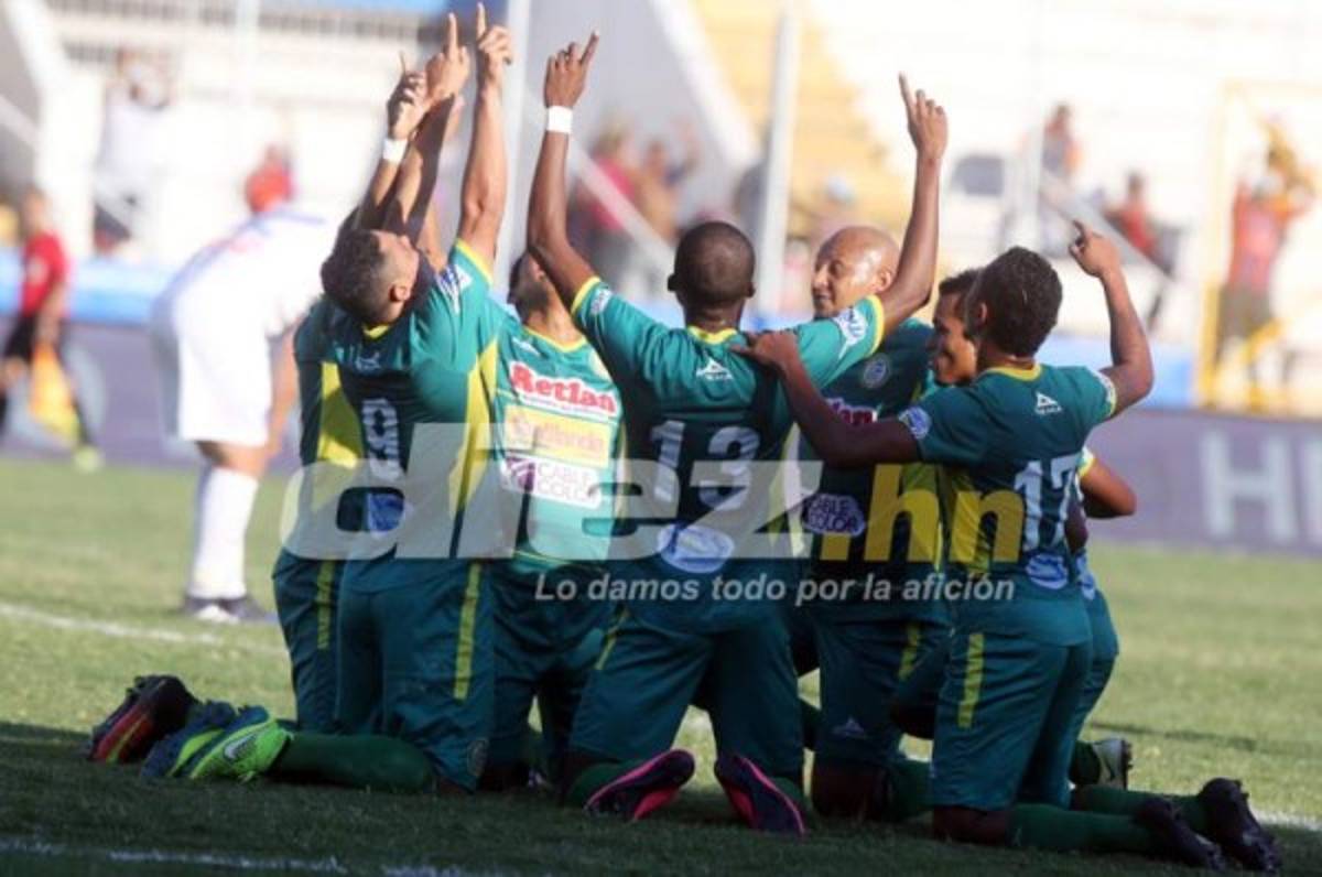 Los jugadores del Juticalpa celebrando el gol con el que empataron al Olimpia.