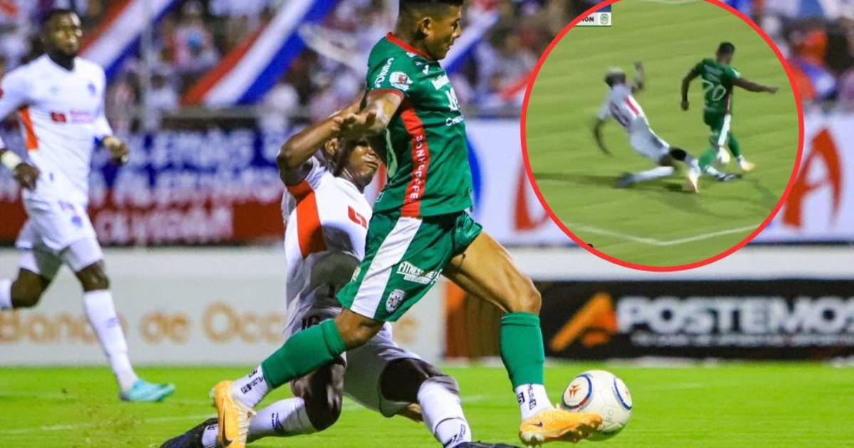 El defensor del Olimpia, Julián Martínez, se barrió fuerte para intentar quitarle el balón al jugador del Marathón, sin embargo, el ‘Chino’ adelantó el esférico antes de la intervención, a lo que el impacto fue inevitable.
