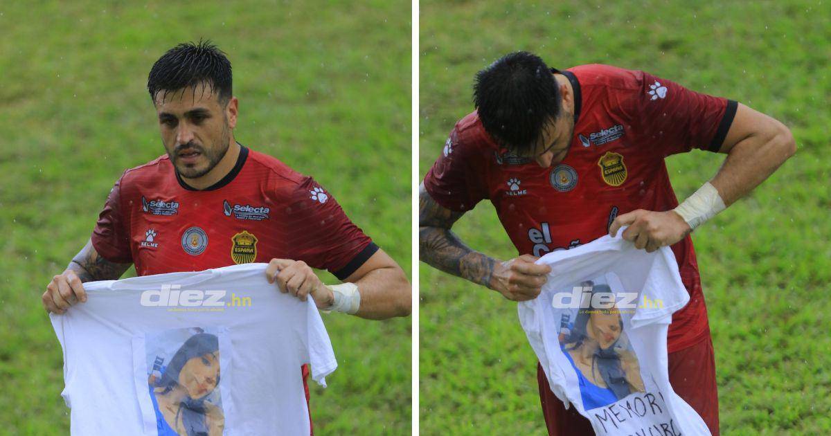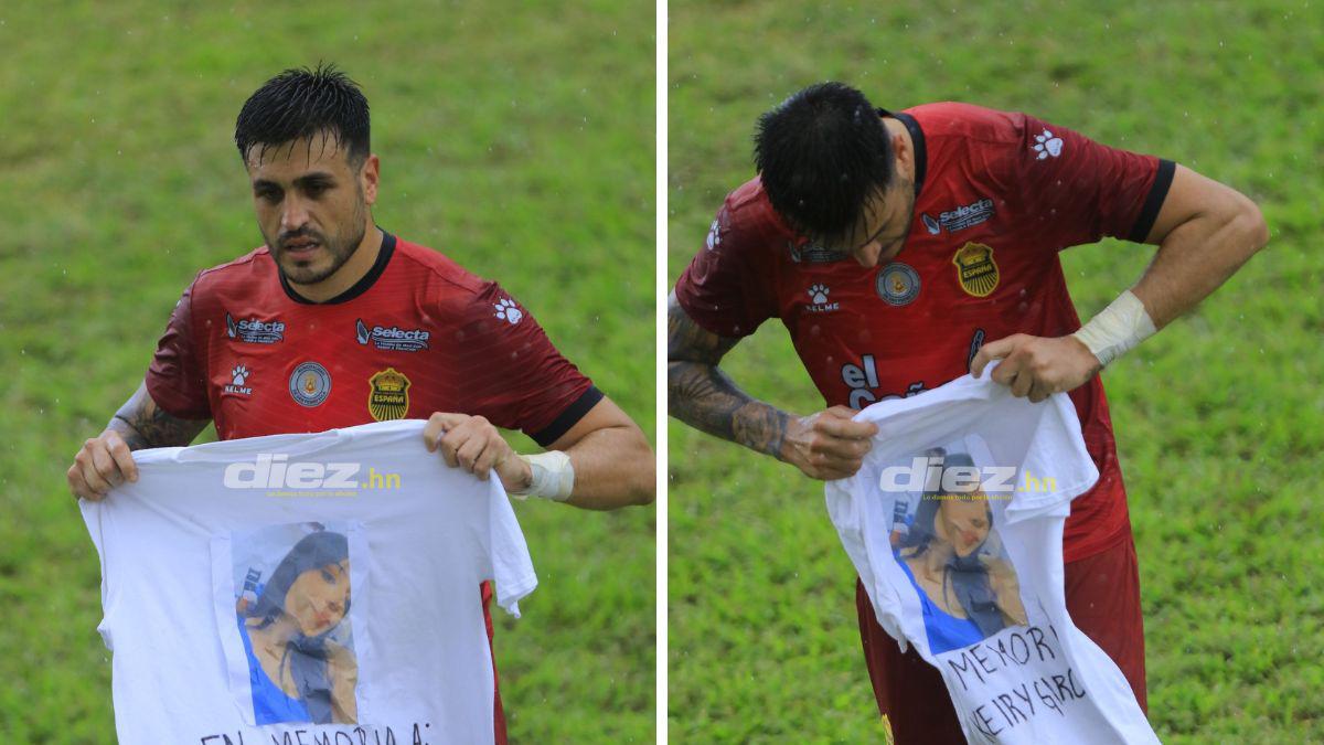 Rocca puso arriba al Real España y en el momento del festejo pidió rápidamente la camiseta donde estaba estampada una foto de Keiry García, gran aficionada del equipo aurinegro y venía acompañada de unas palabras que decían: “En memoria a: Keiry García”.