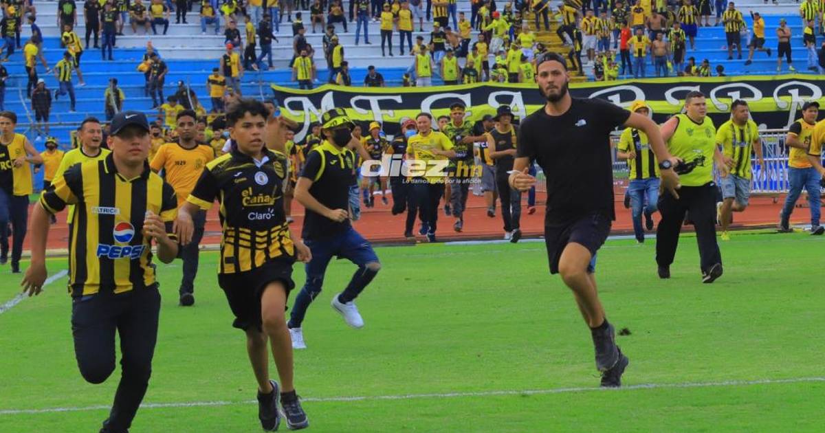 Los hinchas locales se fueron hacia el sector de Sol Sur y comenzaron a lanzar todo tipo de objetos a los aficionados de Motagua que buscaban irse a la parte alta de la gradería, otros decidieron salir corriendo del inmueble buscando irse hacia sus casos y no les permitieron ver la celebración.