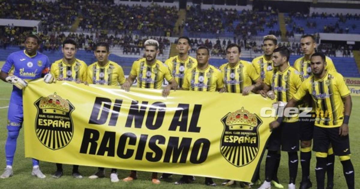 Los jugadores de la Máquina, anfitriones del encuentro de la jornada 2 del torneo Clausura 2020 de la Liga SalvaVida, salieron con una pancarta amarillo y negro con la leyenda 'No al Racismo'.