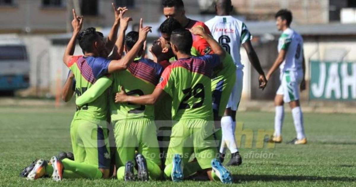 Los jugadores de Real de Minas celebran el primer gol del partido en el Marcelo Ticnoco de Danlí. Foto: Marvin Salgado.