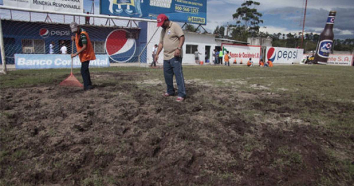 Los constantes aguaceros que han azotado la zona noroccidental del país provocaron que el césped de la instalación copaneca luciera llena de lodo, un terreno no apto para la práctica del fútbol.