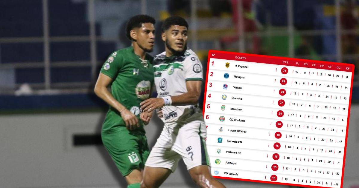 En la parte alta de la tabla se encuentra Real España como líder con 31 puntos; le sigue Motagua con 29, pero con dos partidos menos (juegan el jueves 17 ante Victoria), y luego aparece Olimpia con la misma cantidad de unidades que el Ciclón Azul, aunque con 16 jornadas disputadas.