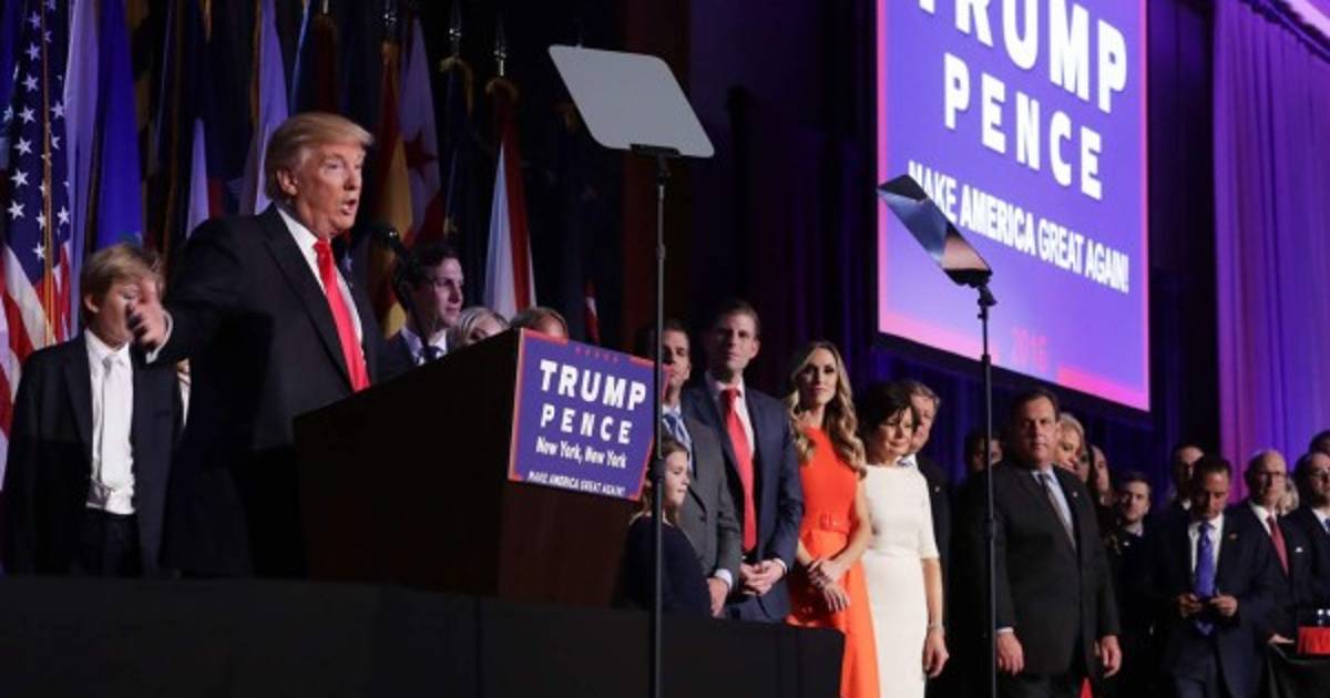 Rodeado por sus familiares, el nuevo presidente estadounidense dijo que su adversaria, Hillary Clinton, lo había llamado por teléfono para felicitarlo por su victoria y afirmó que Estados Unidos tiene una 'deuda de gratitud' con Clinton.