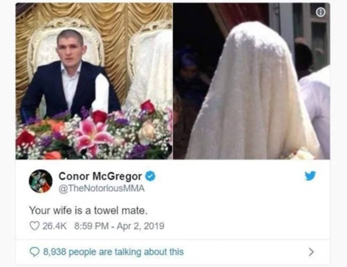 En su constante rivalidad con el ruso Khabib Nurmagomedov, McGregor le dedicó un grave insulto racista a su esposa al publicar una foto de la boda musulmana que realizaron en 2013, donde su mujer lució un velo que le cubría toda la cabeza tal y como marca su religión.