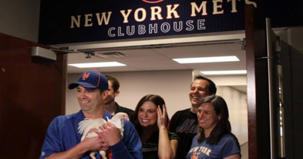 Pero luego el relevista se dio cuenta de que tenía que encontrarle un nuevo hogar. Por lo que una búsqueda en Twitter lo puso en contacto con el Farm Sanctuary de Watkins Glen, Nueva York, que envió un representante al Citi Field el domingo para hacerse cargo de la famosa gallina en una entrega que generó agitación entre los medios neoyorquinos que buscaban documentar un momento indudablemente transcendente cerca de dos horas antes del partido.