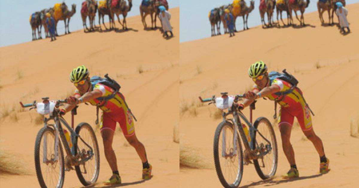 El día estuvo protagonizado por los dos primeros clasificados, que dieron espectáculo en una jornada muy larga, de 115 kilómetros y con un paso final estrella de cuatro kilómetros por las dunas (acumulación de arenas en el desierto) del Erg Chebbi, que a punto estuvieron de dar la vuelta a la carrera. La arena hizo su trabajo y la inmensa mayoría de los corredores tuvo que poner pie a tierra y superarlas arrastrando la bicicleta.