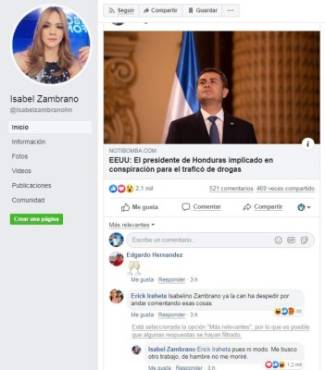 La periodista compartió en su cuenta de Facebook la noticia y de inmediato los comentarios llegaron. El que más llamó la atención fue el de un seguidor que le dijo “Isabel Zambrano ya la van a despedir por andar comentando esas cosas”.