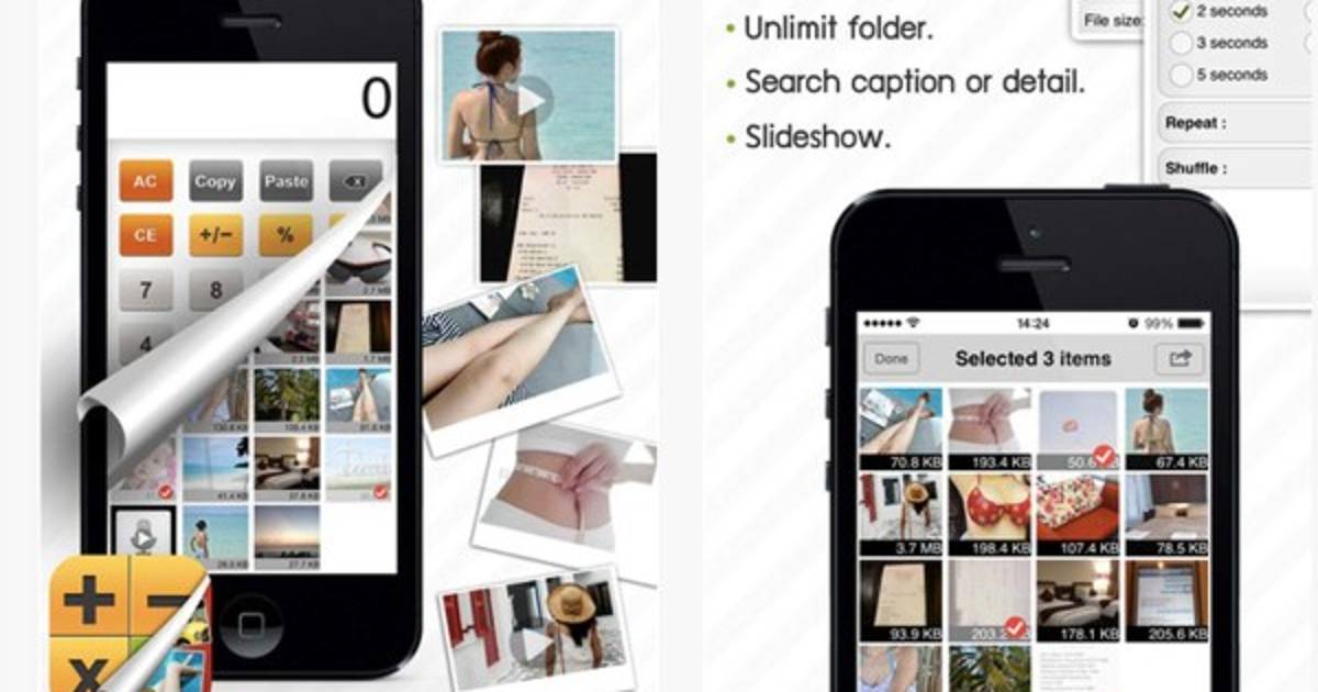 Es una calculadora que cuando metés el código correcto desvela álbumes con las fotografías que deseemos; también incluye un sencillo editor para modificarlas. Al abrir la aplicación se ve como una calculadora, pero si se pone en código de acceso se abrirá un espacio privado.