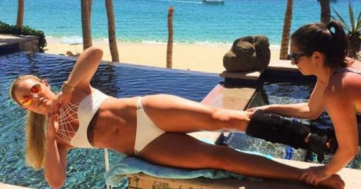 Lejos de encerrarse en un gimnasio para recuperarse, la esquiadora olímpica aprovecha sus días de vacaciones para realizar ejercicios en bikini en la piscina o en la playa junto a su hermana, para así tratar de no perder masa muscular en las piernas.