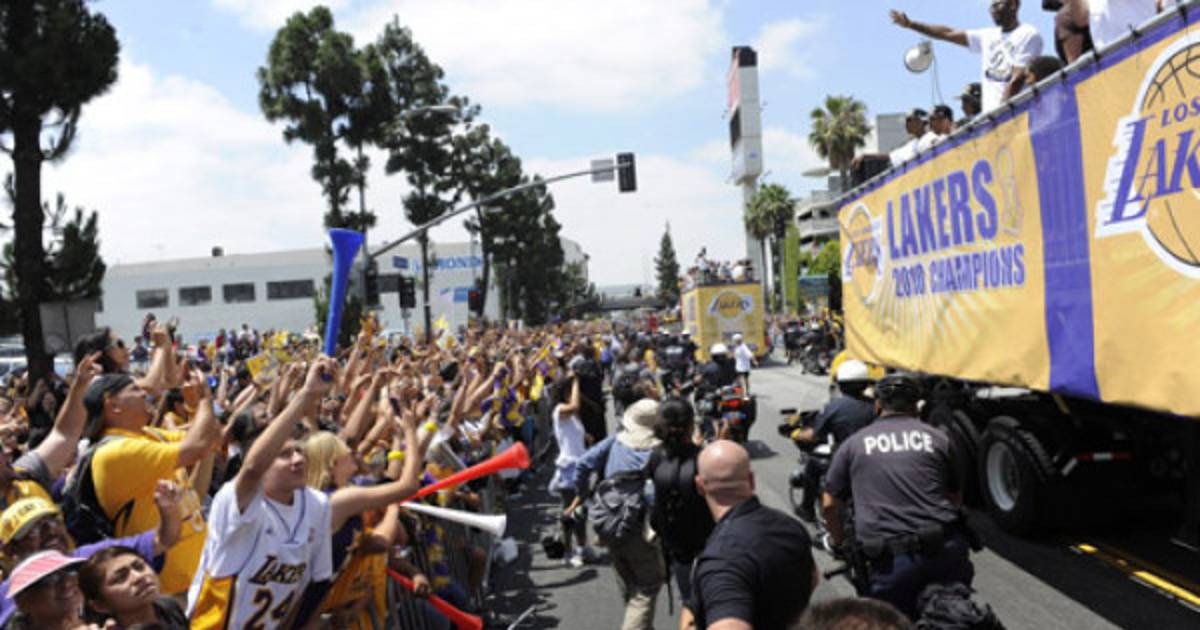 Alrededor de 70.000 personas tiñeron de púrpura y oro las calles de Los Ángeles y reclamaron un tercer título consecutivo de la NBA a los Lakers, que dedicaron el campeonato a los aficionados durante un desfile de tres kilómetros en autobús.