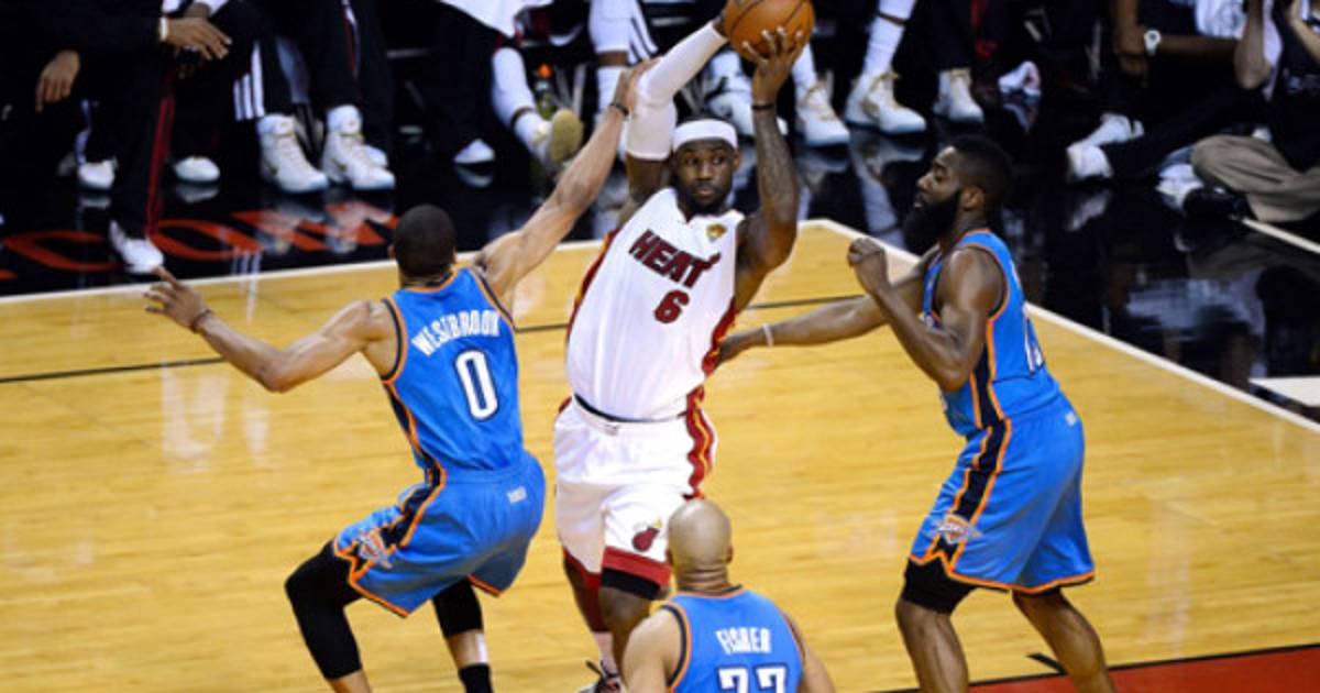 LeBron James, Dwyane Wade y Chris Bosh encestaron los últimos 15 puntos del Heat en los minutos finales para darle vuelta al partido ante Oklahoma City Thunder y llevarse este domingo un ajustado triunfo de 91-85, que coloca a Miami al frente de la final de la NBA.