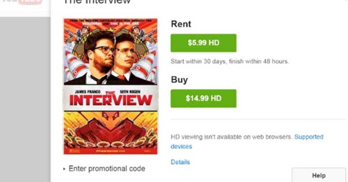 Tras la decisión inicial de cancelar la distribución prevista en cerca de 3.000 salas, por los ataques y amenazas recibidas de un grupo de piratas informáticos, Sony puso el film a disposición de los usuarios en Internet a través de Google Play, YouTube Movies, Microsoft's Xbox Video y un portal llamado SeeTheInterview.com, al precio de 4,99 dólares para el alquiler y 14,99 para la compra.