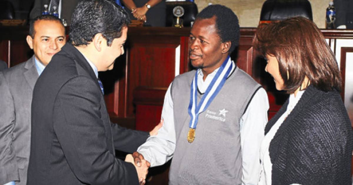 El “Muñeco”, originario de la comunidad garífuna, fue recibido por un prolongado aplauso en el hemiciclo del Poder Legislativo. Luego fue leída su hoja de vida y en la misma se destacó que “Sus contrincantes caen fulminados como por un rayo, cuando él los golpea”.