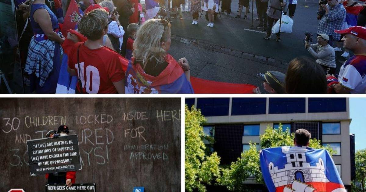 Desafiando la lluvia, medio centenar de personas --entre aficionados al tenis, manifestantes antivacunas y defensores de los derechos de migrantes-- se congregaron en este día de la Navidad ortodoxa en el exterior del centro de retención en Melbourne.