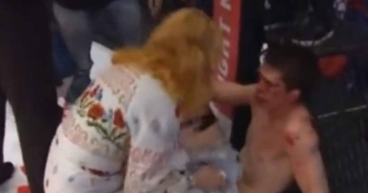 Anna Azovskaya, la madre del luchador, ingresó a la jaula donde estaba tendido su hijo y mientras le limpiaba la cara también le daba cachetadas obligandoló a levantarse.