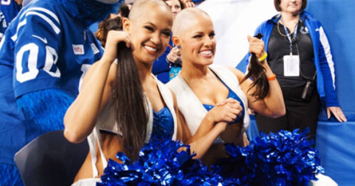 Las porristas de los Potros de Indianapolis, Megan M. y Crystal B. se comprometieron a afeitarse la cabeza si la mascota del equipo, “Blue”, recaudaba 10,000 dólares para la investigación del cáncer en honor del entrenador Chuck Pagano, que fue diagnosticado con leucemia en septiembre.