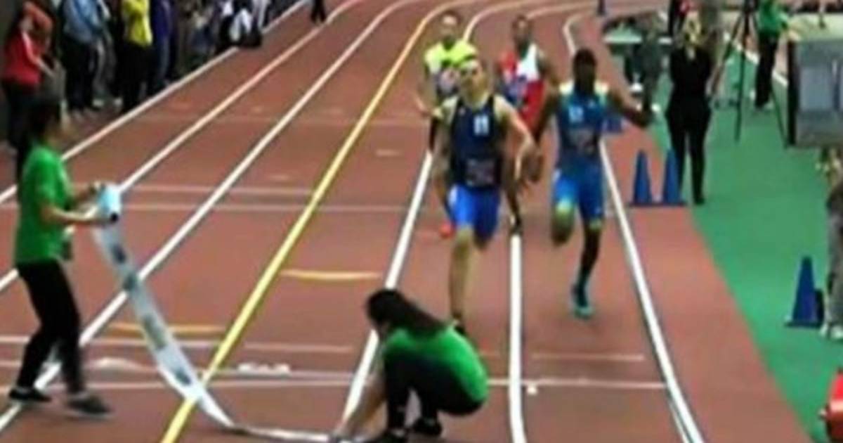 El incidente se produjo en la carrera de los 400 metros en su etapa final competencia en Estados Unidos, cuando una mujer intentaba colocar la cinta de la línea de llegada y de sorpresa le cayeron los corredores encima y uno de ellos la aventó de golpe.