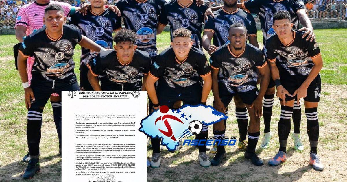 “Esta Comisión de Disciplina el Norte Amateur declara procedente la denuncia y resuelve por unanimidad sancionar el CD San Juan con derrota del partido por retirada o renuncia, en donde el marcador sería de 3-0 a favor del CD Juventus y una multa de 1,000 lempiras basado en el artículo 55 y en relación al artículo 12, 15 suspensión al jugador Dariel Fernando Madrid Cantillano por cinco años de toda actividad deportiva y una multa de 1,000 lempiras”, dice el documento.