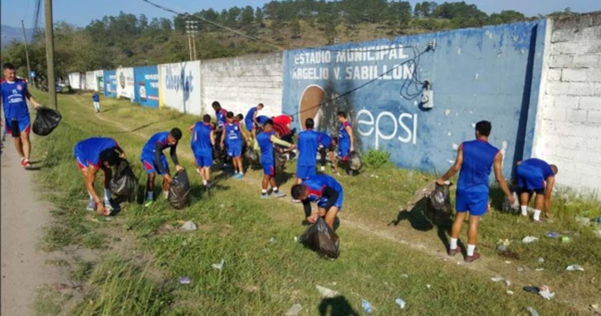 Liga de Ascenso de Honduras dieron el ejemplo a todo este martes al dejar unos instantes el balón para limpiar los alrededores del estadio de Santa Bárbara.