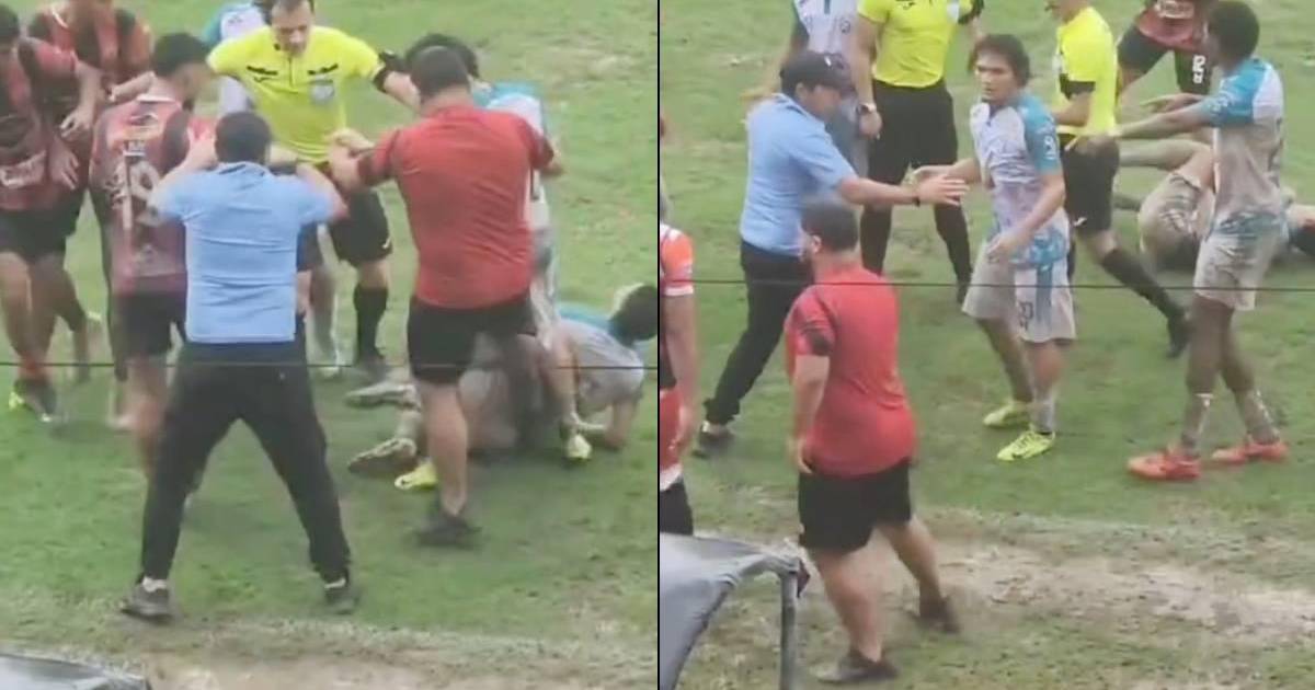 El futbolista con el número 15 en su espalda, Ofir Padilla, estaba en el suelo y quejándose por la fuerte entrada que recibió. Los futbolistas se dijeron de todo y el árbitro estaba interviniendo.