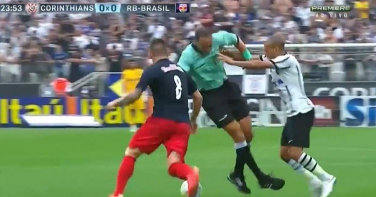 Emerson Sheik, jugador del Corinthians, se lleva todo lo que se le pone enfrente cuando juega y así lo demostró en el momento que el árbitro interfirió en la jugada en el duelo ante Red Bull Brasil por el Paulistao.